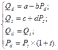1. Определим первоначальные параметры равновесия. Приравняем функцию спроса к функции предложения и определим равновесную цену, учитывая, что в точке равновесия Pd=Ps=P. 2. Излишки потребителей до введения налога: CS1= 3. Излишки производителя до введения налога: PS1= 4. Новая (после введения налога) функция предложения будет иметь вид: 5. Определим равновесные цену и объем продаж после введения налога, приравняв функции спроса и предложения: 8-Pd= 6. Доходы государственного бюджета от введения налога составят: Т= 7. Налоговое бремя на потребителей Tc= 8. Налоговое бремя на производителей TР=1,32-0,637=0.683. 9. Излишки потребителя после введения налога: CS2= 10. Излишки производителя после введения налога: PS2= 11. Чистые потери общества от введения налога: DWL= Рассмотрим вариант решения, соответствующий введению подобного налога на потребителя. В результате введения налога спрос уменьшится. Как видно из графика, пересечение «новой» функции спроса и функции предложения определит значение Ps - «цены производителя», а для нахождения цены потребителя необходимо к Ps прибавить (t∙Ps). В точке равновесия объем спроса равен объему предложения. Введем обозначение: Qd=Qs=Q. Тогда система (4) можно записать в виде