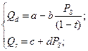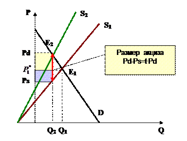 Второе уравнение системы (7) определяет новую функцию предложения, которая по отношению к первоначальной выглядит повернутой против часовой стрелки вокруг точки пересечения с осью Q. Чтобы определить цену, которую получит производитель за товар («цену производителя» - Ps) – необходимо вычесть из Pd величину t∙Pd. Предположим государство ввело адвалорный акциз на потребителя. В результате введения налога спрос уменьшится. Как видно из графика, пересечение «новой» функции спроса и функции предложения определит значение Ps - «цены производителя», а для нахождения цены потребителя необходимо к Ps прибавить (t∙Pd).