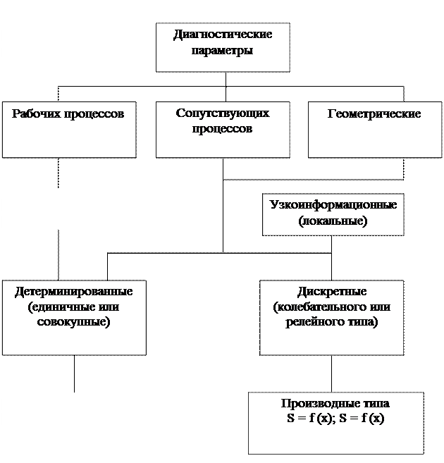 Любая техническая система, включающая упорядочную структуру элементов, может быть объектом диагностирования. Их работа обусловлена взаимодействием между собой или со средой. Это взаимодействие может быть выражено и измерено физическими величинами (линейными, электрическими, химическими и т.п.), называемыми структурными параметрами или параметрами технического состояния. В процессе эксплуатации эти параметры непрерывно или дискретно изменяются от номинальных параметров до предельных параметров. Это позволяет определить техническое состояние объекта путем замера совокупности структурных параметров объекта и их сравнения с нормативными параметрами, обуславливающих исправное состояние объекта. Бытовая техника также является объектом диагностирования как для получения информации о соответствии технических параметров нормативным (экспертиза), о техническом состоянии объекта и возможности ее получения (диагностика). В случае проведения экспертизы необходимо оценить параметры объекта, определяющие его функциональные возможности, и выбрать средства для их регистрации. На основании совокупности полученных диагностических параметров и их сравнения с нормативными (документальными параметрами) делается вывод о качестве объекта. В случае диагностирования технического состояния объекта необходимо знать законы распределения отказов его элементов и процессов изменения технического состояния объекта, а также затраты на его техническое обслуживание и ремонт. Для диагностирования объекта необходимо выбрать систему контролеспособности, которая определяется трудоемкостью и стоимостью диагностических работ. Агрегаты, системы и механизмы разнородны по принципу действия (газодинамические, тепловые, механические процессы), неравнопрочны, имеют различные показатели надежности и т.п. Все это позволяет использовать различные методы и средства диагностирования. Для определения технического состояния объекта используют диагностические параметры, классификация которых приведена ниже (рис. 1.2). По принципу образования диагностические параметры подразделяются на параметры рабочих процессов, сопутствующих процессов и геометрические. Параметры рабочих процессов, определяющих основные, функциональные свойства объекта, дают обобщенную и широкую информацию о его состоянии. Эта информация является основой для дальнейшей поэлементной диагностики. Параметры сопутствующих процессов (например, вибрация, шум, нагрев) дают более узкую информацию о техническом состоянии объекта диагностики. Это косвенные величины и требуется установить связь (закономерность) с реально происходящими процессами. Тем не менее, они достаточно универсальны и широко применяются для поэлементного диагностирования сложной бытовой техники.