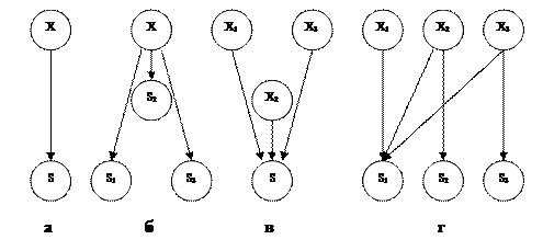 X - структурный параметр S – диагностический параметр Рис.1.3 Связи между структурными и диагностическими параметрами. Единичная связь (рис.1.3а) устанавливает однозначную зависимость между структурными (х) и диагностическим (s) параметрами (например, замер мощности, частоты вращения). Множественные связи (рис.1.3б) возникают тогда, когда один структурный параметр приводит к возникновению нескольких диагностических параметров (например, о величине износа в сопряжениях можно судить по величине вибрации, шума, крутящего момента и т.п.). Неопределенные связи (рис.1.3в) возникают тогда, когда один диагностический параметр зависит от нескольких структурных параметров. Например, машина включает несколько узлов, в которых происходит процесс износа, о величине которых можно судить по уровню шума или вибрации. Самыми неопределенными связями являются комбинированные связи (рис.1.3г), когда несколько структурных параметров регистрируются разными диагностическими сигналами. Например, о величине износа в различных кинематических парах узлов машины можно судить по различным диагностическим параметрам, полученным при замере уровня шума, вибрации, спектральном анализе масляной среды и т.п. Характер связей между структурными и диагностическими параметрами выражает их информативность и определяет методы обработки информации при постановке диагноза.