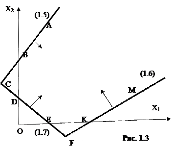 РЕШЕНИЕ. Построим прямые и определим решения неравенств (1.5)-(1.7). ОР и ОДР являются неограниченные многогранные области ACFM и ABDEKM соответственно (рис. 1.3). Пример 3. Найти ОР и ОДР системы неравенств