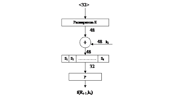 Р – перестановка битов. Для вычисления значения функции f используется: · функция Е (расширение 32 бит до 48); · функция S1 S2 …S8 (преобразование 6-битового числа в 4-битовое); · функция Р (перестановка битов в 32-битовой последовательности). Функция расширения Е определяется следующий таблицей: