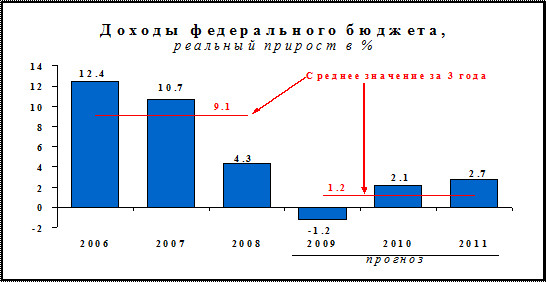 Ненефтегазовый доходы федерального бюджета в 2009-2011 годах находятся на уровне 12,1% ВВП. 2. Происходящее в последние годы и прогнозируемое укрепление рубля, связанное с объективными макроэкономическими условиями – такими, как сохранение высоких цен на товары российского экспорта и расширение притока иностранного капитала – существенно снижает поступления в бюджет нефтегазовых доходов (которые «привязаны» к стоимости экспорта, либо пропорциональны обменному курсу доллара – как НДПИ на нефть). 3. Прогнозируемое снижение цен на нефть с 92 долл. США за баррель в 2008 году до 72 долл. США за баррель в 2011 году.