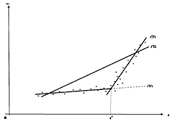 Рис. 1. Изменение характера тенденции временного ряда Момент времени t* сопровождается значительными изменениями ряда факторов, оказывающих сильное воздействие на изучаемый показатель yt. Чаще всего эти изменения вызваны изменениями в общеэкономической ситуации или факторами глобального характера, приведшими к изменению структуры экономики. Если исследуемый временной ряд включает в себя соответствующий момент времени, то одной из задач его изучения становится выяснение вопроса о том, значимо ли повлияли общие структурные изменения на характер этой тенденции. Если это влияние значимо, то для моделирования тенденции данного временного ряда следует использовать кусочно-линейные модели регрессии, т.е. разделить исходную совокупность на две подсовокупности (до момента t* и после момента t*) и построить отдельно по каждой подсовокупности уравнения линейной регрессии: y(1) = a1 + b1t; y(2) = a2 + b2t. Если структурные изменения незначительно повлияли на характер тенденции ряда уt, то ее можно описать с помощью единого уравнения тренда для всей совокупности данных: y(3) = a3 + b3t. Каждый из описанных выше подходов имеет свои положительные и отрицательные стороны. При построении кусочно-линейной модели происходит снижение остаточной суммы квадратов по сравнению с единым для всей совокупности уравнением тренда. Однако разделение исходной совокупности на две части ведет к потере числа наблюдений и, следовательно, к снижению числа степеней свободы в каждом уравнении кусочно-линейной модели. Построение единого для всей совокупности уравнения тренда, напротив, позволяет сохранить число наблюдений n исходной совокупности, однако остаточная сумма квадратов по этому уравнению будет выше по сравнению с кусочно-линейной моделью. Очевидно. что выбор одной из двух моделей будет зависеть от соотношения между снижением остаточной дисперсии и потерей числа степеней свободы при переходе от единого уравнения регрессии к кусочно-линейной модели. 2. Формальный статистический тест для оценки этого соотношения был предложен Грегори Чоу. Применение этого теста предполагает расчет параметров уравнений трендов для всех кусков прямых и единой прямой. Введем систему обозначений. n1 и n2 – число наблюдений по кусочно-линейной модели; n – число наблюдений по всей совокупности; С1ост и С2ост – остаточная сумма квадратов по кусочно-линейной модели; С3ост – остаточная сумма квадратов по всей совокупности; k1 и k2 – число параметров в кусочно-линейном уравнении; k3 – число параметров в едином уравнении; n1 – k1 и n2 – k2 – число степеней свободы остаточной дисперсии в кусочно-линейном уравнении; n – k3 = (n1 + n2) – k3 - число степеней свободы остаточной дисперсии в едином уравнении тренда. Выдвинем гипотезу Н0 о структурной стабильности тенденции изучаемого временного ряда. Остаточную сумму квадратов по кусочно-линейной модели (Склост) можно найти как сумму С1ост и С2ост: Склост = С1ост + С2ост (1) Соответствующее ей число степеней свободы составит: (n1 – k1) + (n2 – k2) = (n – k1 – k2). (2) Тогда сокращение остаточной дисперсии при переходе от единого уравнения тренда к кусочно-линейной модели можно определить следующим образом: ΔСост = С3ост – Склост. (3)