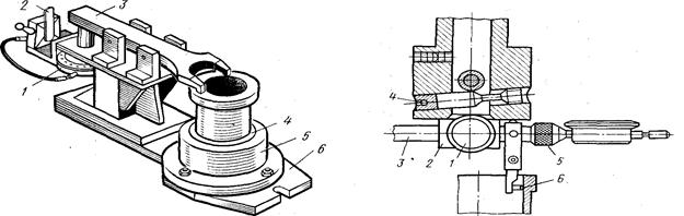где d — диаметр резцовой головки, мм; D — диаметр цилиндра на глубине 3 — 4 мм от верхнего торца цилиндра, мм. После проверки микрометром значения l оправку закрепляют и опускают шпиндель на указанную глубину в цилиндр. При вращении резцовой головки шаровой конец оправки скользит по образующей цилиндра и устанавливает деталь (приспособление) по оси шпинделя. Точность центровки проверяют при помощи индикаторного приспособления (центроискателя) (см. рис. 4.3), колодка 2 которого ввинчивается в торец резцовой головки шпинделя. Упор 6 рычага подводят к зеркалу цилиндра на глубине 3 — 4 мм, положение рычага 3 фиксируется винтом 1 и гайкой 5. Шкалу индикатора устанавливают на "О" и поворотом шпинделя на один оборот определяют погрешность центрирования. При необходимости корректируют положение детали. Таблица 4.3. Размеры гильз цилиндров двигателей