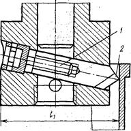 Примечание. В таблице применяется сокращение РГ — размерная группа. Вылет l1 резца регулируют (рис. 4.4) при помощи винта 1 с лимбом, ввинчиваемого в торец резца 2. Расстояние l1 в миллиметрах от вершины резца до диаметрально противоположной стороны резцовой головки