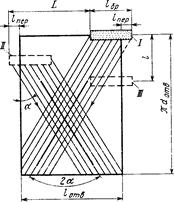 Рис. 4.6. Развертка сетки следов обработки при хонинговании цилиндров блока: L — ход хонинговальной головки; lотв — длина цилиндра; lбр — длина абразивного бруска хонинговальной головки; lпер — перебег абразивных брусков за края цилиндра; a — угол подъема следа; 2а — угол скрещивания следов; /, //, /// — последовательные положения бруска за один двойной ход