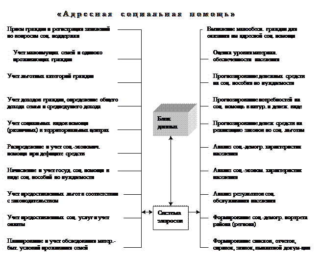 Данная АИС разработана по заказу Министерства труда и социального развития РФ [14] Тульским проектным конструкторско-технологическим институтом автоматизированных систем управления, который с 1993 г. занимается разработкой и внедрением информационных технологий для учреждений и органов социальной защиты населения, оказывающих социальную поддержку различным слоям населения. Система используется в большинство субъектов Российской Федерации, поддерживается и постоянно развивается. Программная система ориентирована на работу органов и учреждений социальной защиты населения, хотя может быть использована и в других отраслях. Она нацелена на обеспечение специалистов и руководителей информационной технологией, решающей следующие задачи: • создание механизмов эффективного распределения ограниченных бюджетных средств; • определение приоритетов в социальной политике региона; • прогнозирование ресурсов в натуральном и денежном выражении для оказания социальной помощи; • анализ социально-демографической и социально-экономической ситуации в любом районе или регионе; • обеспечение учета финансов по направлениям финансирования; • подготовка различных документов для оказания адресной социальной помощи; • получение необходимых форм отчетности; • создание имитационных моделей для принятия решений как об оптимальном распределении ресурсов в условиях ограниченных финансовых средств, так и при подготовке решений по изменению и дополнению существующего законодательства. Система работает на четырех уровнях: территориальные центры, местный, региональный и федеральный уровень. Имеется механизм агрегации и передачи информации с низшего уровня на более высокий. В АИС "Адресная социальная помощь" входят шесть программных комплексов: 1. Прием граждан и адресная социальная помощь. 2. Назначение и выплата социальных пособий по нуждаемости. 3. Прогнозирование ресурсов для социального обслуживания населения. 4. Анализ результатов социального обслуживания населения 5. Формирование социально-демографического портрета района и региона. 6. Предоставление социальных услуг В своей работе система использует единый информационный банк данных, в который поступает информация из всех комплексов системы. Функциональная схема АИС “Адресная социальная помощь” и схема базы данных представлены на рис. 2, 3. За единицу учета в АИС "Адресная социальная помощь" принята семья (домохозяйство), т.е. совместно проживающие и совместно ведущие домашнее хозяйство граждане. Одинокий или одиноко проживающий гражданин также представляет семью из одного человека. Карточка учета семьи содержит следующие сведения: • учетные данные каждого члена семьи (Ф.И.О., дата рождения, трудовой стаж, паспортные данные, место жительства, образование, профессия, место работы или учёбы, номер школьного или дошкольного учреждения); • признаки совместного проживания и совместного ведения хозяйства; • признаки учета граждан и семьи в целом, индивидуальные, в том числе льготные категории; • виды и размер доходов; • виды заболеваний и данные справок органов медико-социальной экспертизы, рекомендуемые реабилитационные мероприятия; • виды удостоверений, их номер и дату выдачи; •. потребности (виды заявок) в видах льгот, услуг и социальной помощи граждан или семьи в цел