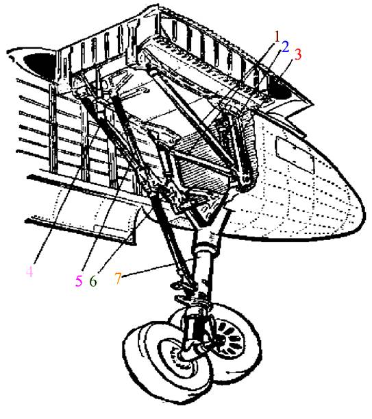 Рис. 3.37. Фермово-балкове шасі: 1 – підкоси силової ферми; 2 – гідроциліндр прибирання-випуску шасі; 3 – стійка силової ферми; 4 – замок прибраного положення; 5 – підкіс, що складається; 6 – розпір-замок випущеного положення; 7 – амортизаційна стійка.