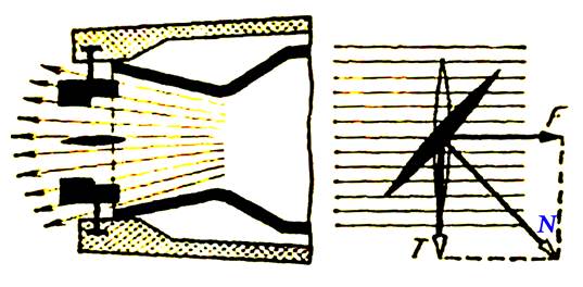 Подібно до літака ракета має поздовжню, поперечну і шляхову керованість. Керуючі моменти створюються за аеродинамічним або реактивним принципом. Аеродинамічні керма ракети подібні літаковим. Вони ефективні тільки в щільних шарах атмосфери. Реактивний принцип керування ракетою може здійснюватися різними способами. В даний час найбільш часто застосовуються три способи керування: – за допомогою газодинамічних рулів (рис. 4.23); – зміною напряму тяги ракетного двигуна (рис. 4.24); – застосуванням спеціальних двигунів керування, так званих верньєрних двигунів (рис. 4.25). При відхиленні газодинамічного керма, що знаходиться в реактивному соплі (рис. 4.23), виникає газодинамічна сила N, момент якої щодо центру мас ракети є таким, що керує.