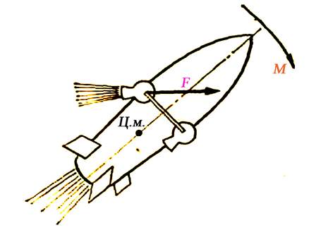 Рис. 4.24. Керування ракетою зміною напряму тяги ракетного двигуна. Якщо до корпуса ракети (рис. 4.25) на шарнірах прикріпити додаткові двигуни, то, повертаючи їх, можна змінювати напрям їх тяги F, яка створює щодо центра мас ракети момент М. Цей момент є керуючим, тому що він змінює траєкторію руху ракети.