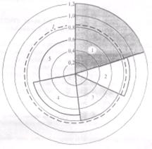 Для получения наглядного представления об уровне качества выпускаемой предприятием продукции можно использовать круговые диаграммы, построенные по относительным показателям качества продукции и их коэффициентам весомости. Каждый показатель изображается на диаграмме в виде кругового сектора, радиус которого riравен значению показатели относительно выбранного аналога, a центральным угол - коэффициенту весомости, выраженному условной величиной в градусах или радианах. Базовые значения для всех показателей изображаются окружностью, имеющей радиус, равный единице. Центральный угол для i-того показателя определяется как φ= 2πai, рад. или φ= 360ai. Уровень качества продукции определится на основе комплексного среднего взвешенного показателя Ук, именуемого здесь средним взвешенным круговым показателем. Он равен радиусу круга, площадь которого равна сумме площадей секторов диаграммы. Его расчет можно осуществить по формуле: