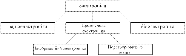 Електроніка як наука займається вивченням електронних процесів у вакуумі, газах та напівпровідниках. У залежності від мети, якій вона слугує, електроніка підрозділяється на: радіоелектроніку, промислову електроніку та біоелектроніку. Електронна техніка, яка використовується для розв’язання різноманітних задач виробництва, отримала назву промислової електроніки. В свою чергу промислова електроніка поділяється на інформаційну та енергетичну. Інформаційна електроніка - електронні системи і пристрої, які пов’язані з вимірами, контролем та керуванням промисловими об’єктами або технологічними процесами. Енергетична електроніка (або перетворювальна техніка) займається перетворенням електричного струму промислової частоти для його більш широкого вжитку в електроприводі, електротермії, в електроенергетиці. Сюди відносяться: випрямлячі – перетворення змінного струму в постійний; перетворювачі частоти – перетворення змінного струму промислової частоти в змінний іншої частоти; інвертори – перетворення постійного струму в змінний тощо.