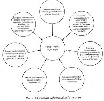 3.Складові інформаційної культури та основні види інформаційних послуг Для вільної орієнтації в інформаційному потоці людина повинна володіти інформаційною культурою як однією зі складових загальної культури. Інформаційна культура пов'язана із соціальною природою людини. Вона є продуктом різноманітних творчих здібностей людини і виявляється в таких аспектах (див. рис. 1.3): Ø вміння працювати з різними видами інформації; Ø володіння основами аналітичної обробки інформації; Ø здатність представляти необхідну інформацію в зрозумілому вигляді і вміння її ефективно використовувати; Ø Ø вміння знаходити необхідну інформацію з різних джерел; Ø конкретні навики щодо засобів використання технічних пристроїв від телефону ПК і комп’ютерних мереж. Інформаційні ресурси суспільства. Одним із ключових понять при інформатизації суспільства стало поняття "інформаційні ресурси". Ресурс - це запаси, джерела чого-небудь. У індустріальному суспільстві де велика частка зусиль спрямована на матеріальне виробництво, відомо декілька основних видів ресурсів, що стали вже класичними економічними категоріями: матеріальні ресурси; природні; трудові; фінансові; енергетичні ресурси. У інформаційному суспільстві акцент уваги і значущості зміщується з традиційних видів ресурсів на інформаційний ресурс, який хоч завжди існував, але не розглядався ні як економічна, ні як жодна інша категорія. Інформаційні ресурси суспільства можна розуміти як знання, відчужені від тих людей, які їх накопичували, узагальнювали, аналізували, створювали тощо. Ці знання матеріалізувалися у вигляді документів, баз даних, баз знань, алгоритмів, комп'ютерних програм, а також витворів мистецтва, літератури і науки. Інформаційні ресурси країни, регіону, організації повинні розглядатися як стратегічні ресурси, аналогічні за значущістю до запасів сировини, енергії, корисних копалин та інших ресурсів. Розвиток світових інформаційних ресурсів дав можливість: Ø перетворити діяльність з надання інформаційних послуг в глобальну людську діяльність; Ø сформувати світовий і внутрішньодержавні ринки інформаційних послуг; Ø утворити різні бази даних ресурсів регіонів і держав, до яких можливий порівняно недорогий доступ; Ø підвищити обґрунтованість і оперативність ухвалення рішень в організацій банках, біржах, промисловості, торгівлі тощо за рахунок своєчасного використання необхідної інформації. Інформаційні ресурси є базою для створеним інформаційних продуктів. Інформаційний продукт - це сукупність даних, сформована виробником для розповсюдження в матеріальній або нематеріальній формі. Виходячи з можливих видів інформаційних продуктів, баз даних і ресурсів, класифікація інформаційних послуг зображена на рис. 1.4. Будь-який інформаційний продукт відображає інформаційну модель його виробника і втілює в життя його власне уявлення про конкретну область, для якої він створений. Будучи результатом інтелектуальної діяльності людини, він повинен бути зафіксований на матеріальному носії будь-якого типу у вигляді документа, статті, огляду, програми, книги тощо. Інформаційний продукт може розповсюджуватися тими самими способами, як і будь-який інший матеріальний продукт, за допомогою послуг.