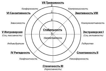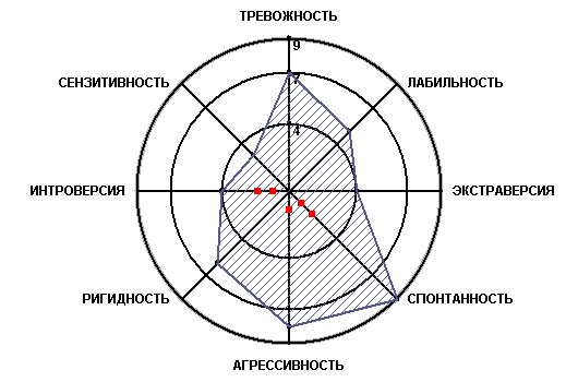 Суммируются значимые ответы, приведенные в ключе. За каждый ответ, совпадающий со значимым, начисляется один балл. Интерпретация находится в прямой зависимости от количества значимых ответов по 8 шкалам (исключая шкалы "ложь" и "аггравация"): · 0-1 балл – гипоэмотивность, плохое самопонимание или неоткровенность при обследовании; · 3–4 балла (норма) – гармоничная личность; · 5–7 баллов (умеренная выраженность) – акцентуированные черты; · 8–9 баллов (избыточная выраженность) – состояние эмоциональной напряженности, затрудненная адаптация. На круговой диаграмме 8 шкал объединены в четыре полярные пары: экстраверсия – интроверсия, спонтанность – сензитивность и т.п.
