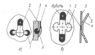 Рис. 1. Соединение сваркой контактного лепестка из плакированного медью алюминия с корпусом из алюминиевого сплава с помощью аргонодуговой сварки (а) и точечной электросварки (б): 1 —место сварки; 2 —лепестки; 3 —корпус; 4 —плакированная поверхность; 5—компаунд