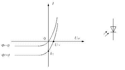 При I = 0 область P заряджається позитивно, а область N – негативно й між електродами фотодіода при освітленні виникає різниця потенціалів, названа фото-ерс, що дорівнює напрузі холостого ходу Uхх.