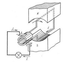Рис.1. Для этого к щеткам А и В вместо электрической лампы необходимо поключить источник постоянного напряжения U. В результате через обмотку якоря, имеющую сопротивление Rя, потечет ток Iя. Взаимодействие этого тока с магнитным полем возбуждения машины создает электромагнитные силы, приводящие якорь во вращение. Устройство машины постоянного тока. Конструкция машины постоянного тока (рис.2.) в основном такая же,