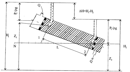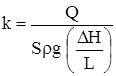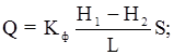 где: Кф – коэффициент, названный коэффициентом фильтрации, зависящий от структуры пористости и свойств флюида; Н1 и Н2 – напоры воды на верхнем и нижнем сечениях трубы; Q - объемный расход жидкости; i – градиент напора; L - длина и S - площадь сечения трубы с песком (рис. 6.2). Последняя формула читается так: скорость фильтрации пропорциональна градиенту напора.