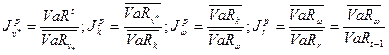 Формула (3.5.15) демонструє спосіб обчислення індексів, один з яких (Jk) кількісно характеризує залежність зміни загальних обсягів валютного портфеля від зміни протягом періоду обмінних курсів валют портфеля, а інший (JV) — від зміни протягом періоду фізичної структури валютного портфеля. Нехай VaRt і VaRt-1 — значення ризикової вартості валютного портфеля відповідно на кінець та початок періоду часу