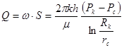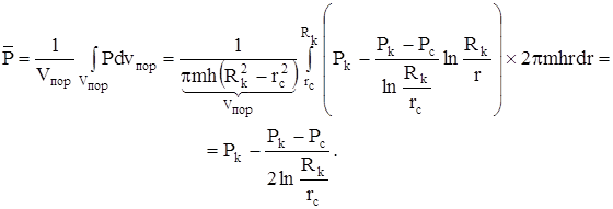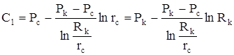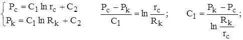 Постоянные интегрирования С1, С2 находим как обычно из граничных условий Р = Рc при r = rc; Р = Рк при r = Rk. Подставляя граничные условия, получаем систему уравнений для нахождения С1, С2: