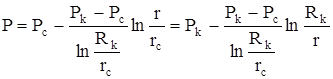 Подставляя найденные значения С1 и С2 в решение, получим зависимость давления от координаты r в плоскорадиальном потоке.