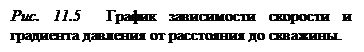 Градиент давления и скорости фильтрации ведут себя одинаково и резко возрастают при приближении к скважине (рис. 11.5). Логарифмическая кривая давления, вращение которой вокруг скважины образует поверхность, называется воронкой депрессии. Основная часть депрессии образуется в призабойной зоне, параметры которой сильно влияют на дебит скважины (рис. 11.6).