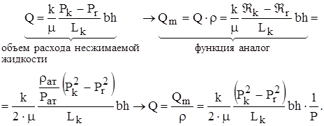 Аналогия заключается в том, что все формулы, полученные для установившейся фильтрации несжимаемого флюида по закону Дарси можно использовать и для установившейся фильтрации сжимаемого флюида в пластах той же геометрии и при тех же граничных условиях, заменив переменные: