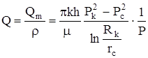 Проницаемость будем считать постоянной. Функцией Лейбензона в этом случае будет выражение: Â Найдем дебит скважины при плоскорадиальном движении, используя аналогию между установившейся фильтрацией несжимаемой жидкости и газа. Для чего заменим в формуле Дюпюи объемный дебит массовым, а