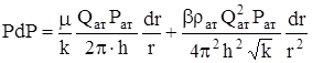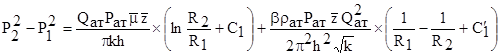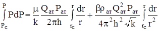 Вблизи высокодебитных газовых скважин происходит нарушение закона Дарси поэтому расчеты, связанные с разработкой газовых месторождений, а также исследованием скважин, проводят обычно по двучленному закону фильтрации. При этом нельзя использовать дифференциальное уравнение фильтрации (DФ = 0 или DÂ = 0 для установившегося движения), т.к. они выведены в предположении справедливости закона Дарси. Будем интегрировать непосредственно 2-х членное уравнение закона фильтрации, которое для плоскорадиального потока имеет вид: