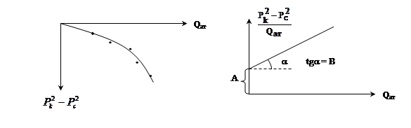 Полученное выше уравнение называется уравнением притока газа к скважине. Коэффициенты фильтрационных сопротивлений А и В определяются опытным путем по данным исследования скважин при установившихся режимах эксплуатации. Газовая скважина исследуется на пяти-шести режимах, задаваемых через изменение забойного давления (давление в скважине Рс). На каждом режиме измеряют приведенный дебит (Qат) и забойное давление (Рс) (по давлению на устье). Затем скважину закрывают и давление в остановленной скважине принимают за контурное - рк. После этого по полученным точкам в координатах (