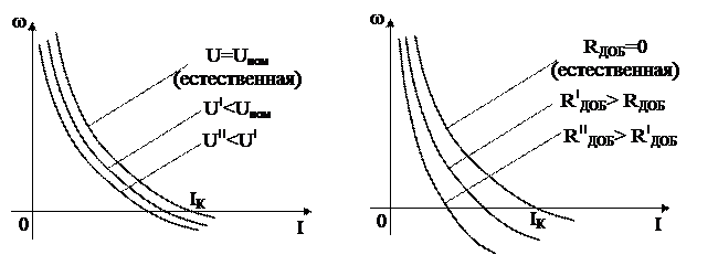 Соответственно уравнение (2.34) – уравнение электромеханической характеристики при изменении напряжения, подводимого к двигателю, а уравнение (2.35) – при введении добавочного сопротивления в цепь якоря.