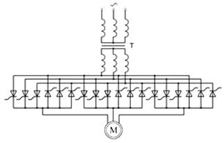 Автоматизированный электропривод переменного тока с непосредственным преобразованием частоты (НПЧ)Преобразователи с непосредственной связью предназначены для однозвенного преобразования энергии переменного тока одной частоты в энергию переменного тока другой (как правило, более низкой) частоты. НПЧ состоит из: 18 управляемых силовых ключей, объедененных в встречно параллельные группы с раздельным или совместным управлением. В основе непосредственного преобразователя лежит трехфазная нулевая схема выпрямления, при этом каждая фаза преобразователя состоит из двух таких встречно включенных выпрямителей состоящих из трех силовых ключей. Группа ключей имеющих общий катод - выпрямительная (положительная), а группа, имеющая общий анод - инверторная (отрицательная). Каждая фаза работает как двухкомплектный реверсивный преобразователь. Вентильные группы каждой фазы могут иметь либо раздельную, либо совместную схему управления. При раздельном управлении управляющие импульсы подаются на силовые ключи только на первые из вентильных групп в соответствии с направлением тока и напряжения в нагрузке. В период прохождения “+” полуволны управляющие импульсы подаются на силовые ключи выпрямительной группы, в период “-” на вход инверторной группы. При раздельном управлении во избежание КЗ применяют специальные логические устройства, которые исключают возможность прохождения тока в одной группе в то время когда работает другая группа. В преобразователях с совместным управлением управляющие импульсы подаются на силовые ключи обеих групп. В этом случае силовая схема предполагает включение ограничительных ректоров для уменьшения уравнительных токов между силовыми ключами катодной и анодной группы. При этом угол управления выпрямительной и инверторной групп изменяется по определенному закону, исключающему появление постоянной составляющей уравнительного тока. Необходимо отметить, что в настоящее время, подавляющее большинство НПЧ работают по принципу раздельного управления. Преимущества раздельного управления: 1.) значительно лучшие массогабаритные показатели. 2.)Примерно в два раза меньше установленная мощность и энергопотребление.