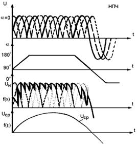 Кривая выходного напряжения НПЧ формируется из отрезков волн напряжения питающей сети. При работе НПЧ на чисто активную нагрузку форма выходного напряжения далека от синусоидальной. Чтобы получить выходное напряжение близкое по форме к синусоидальной необходимо изменять угол управления На диаграмме показано что в течение первой полуволны угол α изменяется 0 до 90 по трапециидальному закону (0-90 перевернутая трапеция, 90-180 прямая трапеция) Рис.37 Для регулирования частоты на выходе преобразователя изменяют периоды коммутации, т.е. при уменьшении периода – выходная частота увеличится, а при увеличении периода – выходная частота уменьшится. Выходная частота НПЧ может быть только меньше частоты питающей сети т.к. выходное напряжение строится из отрезков входного напряжения. Необходимый фазовый сдвиг достигается путем сдвига на определенный угол момента подачи первого управляющего сигнала на каждой из фаз. Этот фазовый сдвиг соответствует симметрии выходного напряжения и составляет угол 1200, а изменение начальной фазы применяется для изменения чередования фаз (реверс). НПЧ выпускают двух модификации: · С фиксированной выходной частотой. · С регулируемой выходной частотой. Если f1 = 50 Гц, то f2 регулируется в приделах от 0 до 25 Гц. Это связанно с тем, что при fвых >50 % очень сильно искажается форма выходного напряжения. С целью расширения верхнего придела регулирования используют источники питания с частотой 100 Гц. В этом случае выходная частота регулируется в диапазоне от 0 до 180 Гц. Достоинства НПЧ: 1. однократное преобразование энергии, боле высокий КПД ≈ 0,97-0,98 2. возможность автономного регулирования U и I. 3. свободный обмен реактивной и активной энергией между сетью и двигателем (обеспечивает возможность работы в режимах рекуперативного торможения и компенсации реактивной энергии). 4. простая реализация бесконтактного реверса. 5. коммутация силовых ключей осуществляется естественным путем. Недостатки НПЧ: 1. ограниченная возможность регулирования частоты от 0 до 40 %. 2. относительно большое число силовых ключей (18 сравнении с 6). 3. сложность системы управления. 4. низкий cosφ (cosφ ≤0,8) Область применения НПЧ в качестве вспомогательного блока в таких электроприводах, как вентильные ЭП