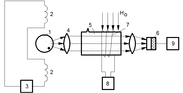 2 – катушка контура; 3 – ВЧ геннератор; 4 – лінзи; 5 – ампула з робочою речовиною; 6 – фотодіод; 7 – радіочастотна катушка; 8 – генератор радіочастоти; 9 – підсилювач.