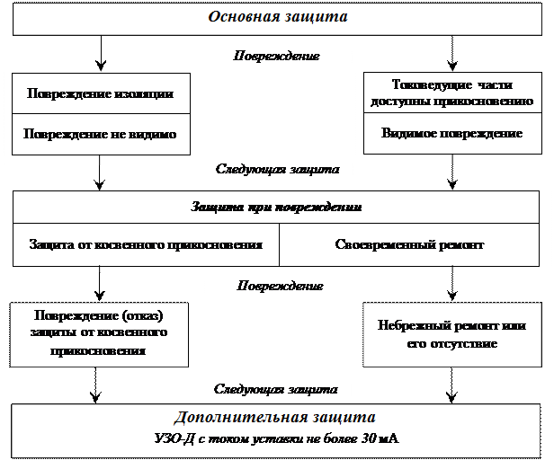 1. В результате повреждения оболочки или ее части становятся доступными для прямого прикосновения опасные токоведущие части. Защита от таких видимых повреждений обеспечивается немедленным ремонтом поврежденного оборудования. 2. Повреждение изоляции между опасными токоведущими частями и открытыми проводящими частями (ОПЧ). При повреждении основной изоляции доступные прикосновению ОПЧ приобретают опасный потенциал, чтоможет не сопровождаться появлением каких бы то ни было видимых для потребителя признаков. Защита при повреждении изоляции должна обеспечивать защиту от поражения электрическим током при косвенном прикосновении в результате такого повреждения. Защита при повреждении изоляции между опасными токоведущими частями и доступными прикосновению открытыми проводящими частями электрооборудования, должна быть обеспечена посредством устройства (с надлежащей изоляцией) автоматического отключения или с помощью других мер защиты при повреждении изоляции. Защита при повреждении может включать одно или более защитных мер: − автоматическое отключение, в том числе, с использованием устройств защиты от сверхтоков и устройств защиты, реагирующих на дифференциальный ток (УЗО-Д); − зануление (система TN); − использование PEN-проводника; − уравнивание потенциалов, в том числе местное; − защитное заземление с использованием защитных устройств для отключения сверхтоков (системы ТТ или IT); − выравнивание потенциала; − постоянный контроль изоляции (ПКИ); − двойная изоляция; − электрическое разделение сетей (разделяющий трансформатор); − безопасное сверхнизкое напряжение (БСНН); − функциональное сверхнизкое напряжение (ФСНН). Дополнительная защита посредством использования УЗО-Д применяется в качестве третьей и последней защитной меры для распределительных сетей. УЗО-Д с током уставки не более 30 мА будет предотвращать возникновение вентрикулярной фибрилляции в результате протекания тока повреждения через тело человека. Дополнительная защита должна применяться для переносных приборов, т.е. для сетей, питающихся от штепсельных розеток, или для сетей, проложенных в помещениях с повышенной опасностью. Согласно современным взглядам электробезопасности полная система защиты должна быть представлена в виде трехступенчатой системы мер, каждая из которых готова действовать для защиты потребителя электроустановки (плак.28.2). Главная задача дополнительной защиты состоит в обеспечении защиты при случайном непреднамеренном прямом прикосновении к токоведущим частям). Более того, дополнительная защита будет предотвращать смертельные поражения электрическим током и в том случае, когда защитный проводник оборван или неправильно присоединен, а также – при повреждении двойной изоляции. Рассматривая оптимизацию защиты, предполагаем, что в жилых, общественных и производственных зданиях и сооружениях нормальные условия окружающей среды. Оптимальная защита достигается применением необходимых и достаточных мер защиты с учетом особенностей электроустановки. Оптимальная система защиты достигается для сетей с номинальным напряжением 230/440 В при использовании зануления (система TN).