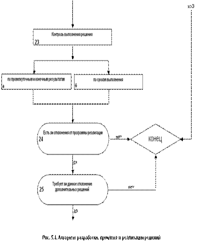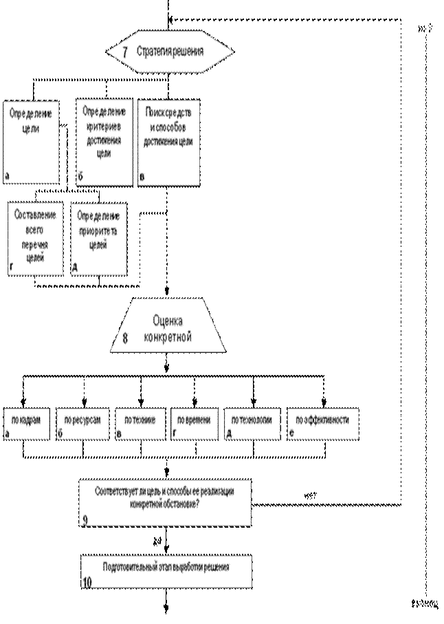 Этап 7. Этап определения стратегии решения. Этот этап сложный и ответственный. Он включает постановку цели, определение критериев достижения цели, поиск средств и способов ее достижения. Для определения главной цели составляем полный перечень целей, а затем на основе количественной и качественной характеристик каждой из них выявляем приоритет какой-либо одной. Особое значение на данном этапе имеет прогностическое обоснование цели. Прогнозное исследование может быть направлено как на определение реально достижимой, отвечающей потребностям общественного развития цели, так и на поиск средств и способов достижения поставленной цели. Определение и декомпозиция целей связана с формулированием главного ограничителя на организационное поведение – целей организации. Цели выражают в процессах принятия решений два главных момента: — некоторую конечную точку (состояние системы), которая должна быть достигнута с помощью путей и средств, которые предстоит выявить и реализовать; — функцию (критерий), которая должна быть использована для оценки последствий альтернативных курсов действий. Декомпозиция цели основывается на трех исходных предпосылках: 1) истема, принимающая решение, рассматривается как внутренне однородная единица, управляемая по конечному состоянию выхода, единому для всей системы; 2) система, принимающая решение, представляет собой множество относительно автономных и взаимодействующих элементов, объединяемых единой целью; 3) система распадается на множество отдельных подсистем, которые имеют самостоятельные несоизмеримые и конфликтные цели. Этап 8. Оценка конкретной обстановки. После разработки стратегии решения необходимо провести оценку обстановки по кадрам (а), ресурсам (б), технике (в), времени (г), технологии (д), эффективности (е) в настоящем с учетом тенденций изменения этих условий в перспективе. Этап 9. Устанавливаем исходя из информации, полученной на этапе 8 (а) — (е), соответствует ли выбор цели и способов ее достижения реальной обстановке. В случае «нет» необходимо вернуться к этапу 7 и вновь пересмотреть стратегию решения, в случае «да» переходим к этапу 10. Этап 10. Подготовительный этап выработки решения, определение круга должностных лиц и функциональных подразделений, которые необходимо включить в ход процесса, а также ответственных за выполнение конкретных работ и должностного лица соответствующей ступени иерархии управления, имеющего право на окончательное принятие решения. Результатом подготовительного этапа должен быть план работ по выработке решения. Этап 11. После подготовительного этапа следует информационный. На этом этапе осуществляются поиск, сбор и обработка необходимой для принятия решения информации: (а) — (г). Можно выделить основные требования к качеству информации для принятия управленческого решения: • своевременность; • достоверность (с определенной вероятностью); • достаточность; • надежность (с определенной степенью риска); • комплексность системы информации (по качеству и ресурсоемкости товара, условиям по стадиям жизненного цикла товаров данного предприятия и конкурентов и т.д.); • адресность; • правовая корректность информации; • многократность ее использования; • высокая скорость сбора, обработки и передачи данных; • возможность кодирования; • актуальность ин