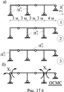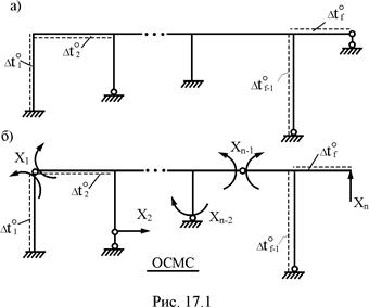 Образуем статически определимую основную систему метода сил (ОСМС), удалив из заданного сооружения n лишних связей (рис. 17.1,б). Неизвестные метода сил X1, X2, …, Xj, …, Xn определим из условия эквивалентности напряжённо-деформируемых состояний заданного сооружения (рис. 17.1,а) и его основной системы (рис. 17.1,б), т.е. из условий равенства нулю перемещений по направлению Xi (i = 1, 2, …, n) в основной системе метода сил от неизвестных этого метода и заданного изменения температуры. Используя принцип независимости действия сил и повторяя выкладки, приведенные в п. 16.2 шестнадцатой лекции, получим систему канонических уравнений для определения неизвестных X1, X2, …, Xj, …, Xn в случае температурного воздействия на сооружение.