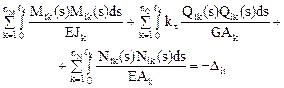 Эпюры внутренних усилий Mс, Qс, Nс в заданном сооружении должны удовлетворять кинематическим условиям, а именно: перемещения по направлению любых усилий Xi (i = 1, 2, …, n) в отброшенных связях в основной системе метода сил от действия всех упомянутых усилий X1, X2, …, Xj, …, Xn и от заданного кинематического возмущения должны быть равны нулю. Другими словами, численные значения перемещений по направлению Xi в статически определимой основной системе от всех неизвестных метода сил будут равны величинам перемещений, вызываемых кинематическим воздействием, с обратным знаком, т.е.