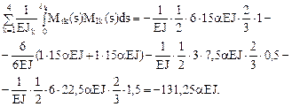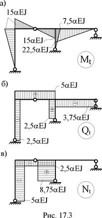 7. Определение изгибающих моментов в сечениях заданной рамы от температурного воздействия и построение эпюры Mt (рис. 17.3,а). Из первого выражения соотношений (17.3) имеем: Mt = M1 X1, где Х1 = –15aEJ. 8. Кинематическая проверка решения задачи. Для этой проверки используем формулу (17.4), в которой сохраним только первый член, ибо коэффициент d11 выше нами был определён только с учётом деформаций изгиба.