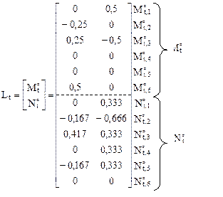 7. Нумерация участков и сечений для формирования матрицы изгибающих моментов и продольных сил от Х1 = 1, Х2 = 1 в основной системе Lt, матрицы температурной податливости сооружения Bt и матрицы приращений температур Т (рис. 17.5,б). Заметим, что при расчёте рамы на температурное воздействие номера участков и их срединных сечений совпадают. 8. Формирование матрицы Lt по эпюрам внутренних усилий M1, N1, M2, N2 (рис. 17.5,а) в соответствии с принятой нумерацией срединных сечений.