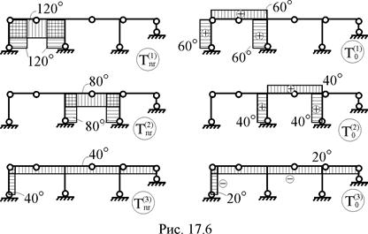 Ординатами этих эпюр (соответственно, и элементами матриц Tnr и T0) на k-том участке являются перепад приращений температур по высоте поперечного сечения 11. Формирование матрицы приращений температур Т по вариантам воздействий (рис. 17.6) в соответствии с принятой нумерацией участков. Правило знаков для элементов матрицы Tnr совпадает с правилом знаков для элементов матрицы М (см. пример 13.4.1 тринадцатой лекции). Знаки элементов подматрицы Т0 совпадает со знаком приращений температуры в центрах тяжести поперечных сечений