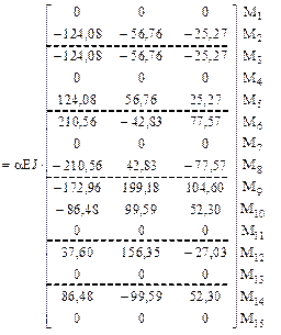 6. Получение матрицы изгибающих моментов Мс в заданной раме по вариантам кинематических воздействий (рис. 17.10) в соответствии с принятой нумерацией участков и сечений (рис. 16.16).