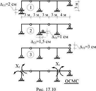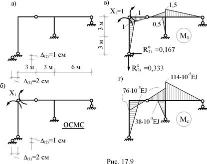 Читателям предлагается (используя соотношение (17.22), самостоятельно произвести кинематическую проверку правильности вычисления элементов матрицы Мс и построить для заданной рамы сначала эпюры изгибающих моментов, а затем и эпюры поперечных и продольных сил от упомянутых выше смещений опорных связей.