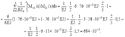 5. Определение изгибающих моментов в характерных сечениях рамы от заданных смещений горизонтальной и вертикальной связей левой опоры и построение эпюры Мс (рис. 17.9,г). Из первого выражения группы соотношений (17.14) следует: Mc = M1X1, где X1 = 76 × 10-5EJ. 6. Кинематическая проверка эпюры Мс по формуле (17.15). В этой формуле сохраним только первый член, учитывающий изгибные деформации элементов рамы.