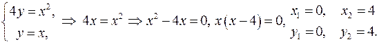 та фігури, яка обмежена лініями та .Обчислимо об’єми тіл, які утворюються при обертанні фігури навколо осей. Знайдемо точки перетину ліній: