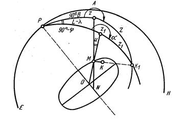 На рис. 5.2 изображена вспомогательная сфера ЕРН. Радиус такой сферы произволен, но во много раз больше радиуса Земли (на рисунке масштаб не соблюден). Р — полюс мира. Полюс мира можно представить как пересечение вспомогательной сферы продолжением оси вращения Земли. Продолжим нормаль и отвесную линию точки Земли М до их пересечения с вспомогательной сферой в точках Z и Z1. Тогда, если МN — нормаль к эллипсоиду в точке М, то Z — геодезический зенит точки М; если МО — отвесная линия в точке М, то Z1 —астрономический зенит точки М (точки Z и Z1 расположены, конечно, не в плоскости чертежа). Угол ZMZ1 = и — уклонение отвесной линии в точке М; PZ — геодезический меридиан точки М; PZ1 — астрономический меридиан точки М; К 1 — точка пересечения визирной линии со вспомогательной сферой при наведении трубы теодолита на земной предмет К. Угол при полюсе ZPZ1 = L — λ — разность геодезической и астрономической долготы. Связь между астрономическими и геодезическими координатами устанавливается через уклонения отвесных линий. Эта связь может быть представлена формулами B = φ + Δφ, L = λ + Δλ, где Δφ и Δλ — функции уклонений отвесных линий. Геодезический азимут А вычисляют через астрономический при помощи уравнения Лапласа А = α + (L — λ) sin φ.