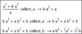 Команда Symbolics/Collect (ключевое слово collect) Выполняет те же преобразования, что и factor, expand, simplify, но результат представляет в виде, упорядоченном по степеням выделенной переменной (при использовании команды Symbolics/Collect следует выделить переменную в выражении следом курсора). Для выполнения этого преобразования с использованием ключевого слова collect следует после ключевого слова через запятую указать имя переменной, по степеням которой следует упорядочить выражение: