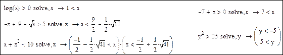 Применение директивы solve для решения неравенств аналогично решению уравнений. Примеры: