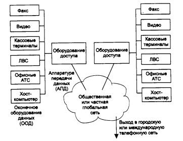 Рис. 20.1. Абоненты глобальной сети Нужно подчеркнуть, что когда идет речь о передаче трафика офисных АТС, то имеется в виду обеспечение разговоров только между сотрудниками различных филиалов одного предприятия, а не замена городской, национальной или международной телефонной сети. Трафик внутренних телефонных разговоров имеет невысокую интенсивность и невысокие требования к качеству передачи голоса, поэтому многие компьютерные технологии глобальных сетей, например frame relay, справляются с такой упрощенной задачей. Большинство территориальных компьютерных сетей в настоящее время обеспечивают только передачу компьютерных данных, но количество сетей, которые могут передавать остальные типы данных, постоянно растет. Отметим, что термин «передача данных» в территориальных сетях используется в узком смысле и означает передачу только компьютерных данных, а передачу речи и изображения обычно к передаче данных не относят.